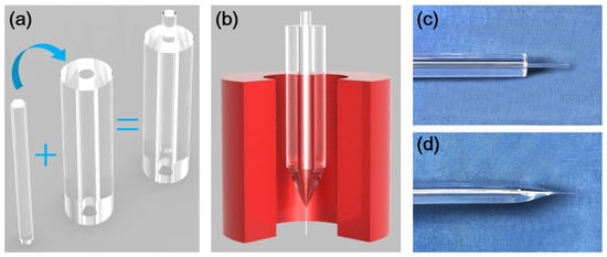 Fabrication of a sapphire-derived fiber (SDF) by the melt-in-tube method. (a) Preparation process of the fiber preform based on sapphire crystal. (b) Diagram of the SDF drawing process; (c,d) shows the photos of the fiber preform rods before and after drawing.