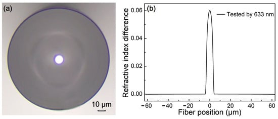 Figure 2a shows the micrograph of the end face of the SDF prepared by the melt-in-tube method. The core diameter is about 10 μm and the cladding diameter is about 125 μm. This is close to the size of a standard single-mode fiber. In addition, since the cladding material is quartz, it can be fused by optical fiber fusion splicer, which is very compatible with quartz optical fiber. The end-face refractive index distribution of the SDF was measured by a fiber end-face refractive index analyzer (SHR-1802, China), and the wavelength of the test light was 633 nm. The end-face refractive index distribution is shown in Figure 2b, and the refractive index difference between the core and the cladding is about 0.06.