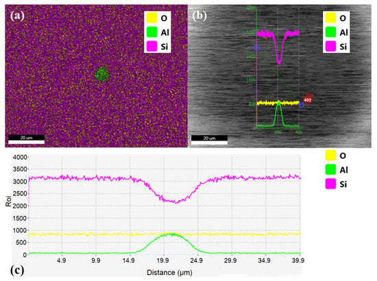 The elements in the SDF core area were tested and analyzed by an EDS, which is produced by EDAX TEAM company of America. In the EDS surface scanning results (shown in Figure 3a), we can see that oxygen, aluminum, and silicon are all present in the core. Oxygen is uniformly distributed, and aluminum is mainly distributed in the core. In the EDS line scanning results of core position (shown in Figure 3b,c), we can see that the content of silicon gradually decreases from both sides to the middle, while the content of aluminum element gradually decreases from the center to both sides, and the distribution of the two elements is parabolic. The core also contains silicon, and the content of silicon in the cladding is obviously higher than that in the core, which indicates that during the high-temperature drawing process, the sapphire single crystal melts, and the core and cladding materials diffuse, so that aluminum and silicon are in a transitional distribution state in the core.