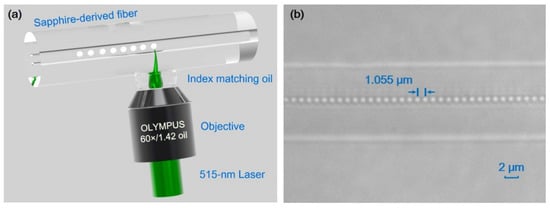 The device for preparing FBGs by the femtosecond laser point-by-point method is shown in Figure 4a. The femtosecond laser (Light-Conversion Pharos, Lithuania) was used with a working wavelength of 1030 nm, repetition frequency of 200 kHz, and pulse width of 290 fs. A frequency doubling crystal (β-BaB2O4) (BBO) was used to double the frequency of the 1030-nm laser emitted by the laser to obtain a 515 nm laser. A shorter laser wavelength is conducive to the realization of finer processing. The 515-nm laser was focused into the center of the SDF core through an oil immersion objective lens (Olympus, 60×/1.42, Japan), and FBGs were prepared by the point-by-point method.