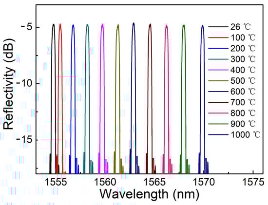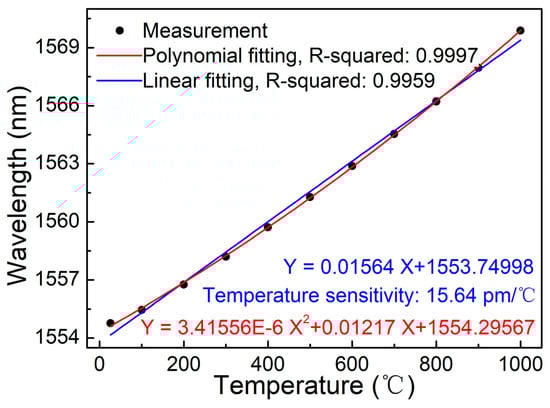 In order to test the high-temperature characteristics of the SDF grating, the prepared FBG was put into a muffle furnace, heated to 1000 °C for 2 h, and then cooled to room temperature. This annealing process was used in order to eliminate the unstable structure and residual stress during the preparation of FBGs by femtosecond laser. Next, the FBG was tested from room temperature to 1000 °C and the temperature test interval was 100 °C. Each temperature point was kept for 30 min, and 11 temperature points were tested. Figure 6 shows the drift curve of the resonant wavelength of the SDF grating with the change of temperature and shows the red shift characteristic.