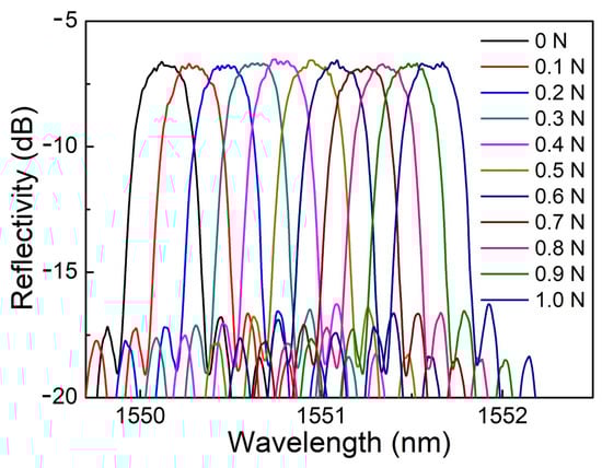 The SDF grating was fixed to the stress-testing device (WDW-100, China); the maximum stress was 1 N, and the test point interval was 0.1 N. The stabilized spectrum was recorded by OSA, and Figure 8 shows the shift curve of resonance wavelength with stress and shows red shift characteristic.