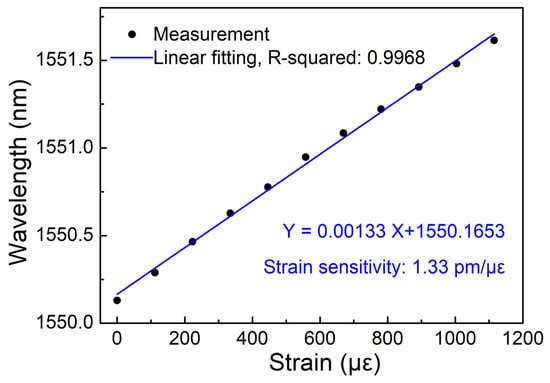 where r is the fiber radius, F is the axial stress, and E is Young’s modulus. Because the main component of the SDF is quartz, the Young’s modulus here is approximately 73 GPa, which does not affect the calculation of strain sensitivity. The linear fitting curve of resonance wavelength and strain is shown in Figure 9, and the strain sensitivity is 1.33 pm/με.
