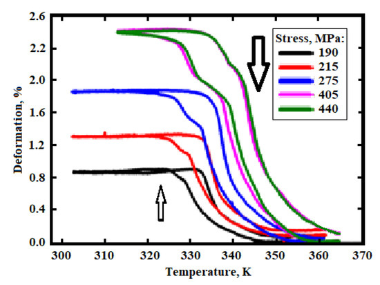 Temperature dependences of sample deformation at various constant mechanical loads (indicated in the inset of the graph, MPa) for an annealed strip (up arrow—direct transformation upon cooling, down arrow—reverse transformation upon heating).