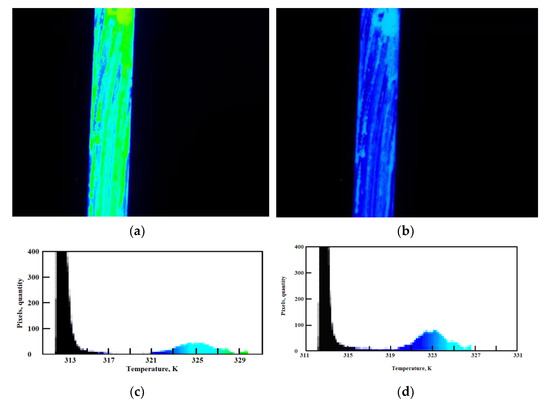 As a result of the measurements of ECE, IR thermograms were obtained and processed. An example of images obtained by a high-speed IR camera from an unstretched and stretched amorphous ribbon of a Ti2NiCu alloy is shown in Figure 3a,b. When stretched, the tape cools were reflected by the color change of the image elements (pixels). For quantitative measurement of the ECE, temperature distribution diagrams of the number of pixels were constructed (Figure 3c,d). In each of the diagrams, a background peak with a room temperature of 300 K (shown in black) and a peak corresponding to the temperature of the sample are highlighted.