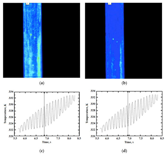 Thermograms of a polycrystalline tape made of Ti2NiCu alloy deformed at a frequency of 6 Hz: a—a tape under load, b—a tape without a load. Dependences of the sample temperature on time (c) and (d) at the time point corresponding to the recording of thermograms (a) and (b), respectively.