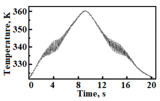 As a result of processing the thermograms, the dependences of the sample temperature on time during heating and back cooling were obtained. An example of such a dependence is shown in Figure 5 at a cyclic load with the amplitude of 100 MPa with an exposure frequency of 10 Hz. The rate of gradual heating of the sample (for measuring the ECE over the entire range of the phase transition and near it) is 4 K/s, and the rate of back cooling is 3.5 K/s. It was experimentally shown that, with a frequency of tension-compression cycles of more than 1 Hz, the process was adiabatic and external heating/cooling did not contribute to the ECE. As can be seen in Figure 5, at a periodic load with an amplitude of 100 MPa and a frequency of 10 Hz, and an increase and then a decrease of the current through the sample, the heating rate of the sample was 4 K/s and the maximum value of the ECE was 7 K.