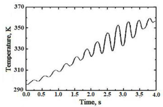 The dependence of the temperature of the sample on time during gradual heating under the influence of external periodic mechanical stress with a frequency of 3 Hz, with a maximum value of 300 MPa.