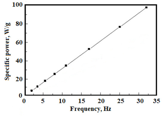 To assess the possibility of using rapidly quenched Ti2NiCu ribbons as a working fluid in elastocaloric heat pumps, in Figure 8, the plot of the specific power versus the frequency of the external periodic force on the studied tapes is given.