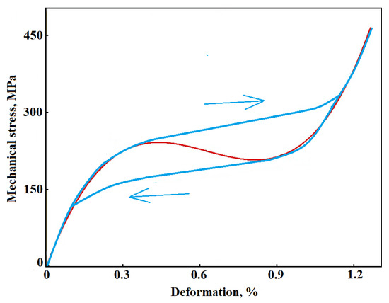 Substituting expression (6) into (9), we obtain the thermal equation of state (11). The graph of this expression is sketched in Figure 9. The coefficients describing a cubic relationship, are taken as follow: a = 1.4 × 1010 Pa, b = −1.5 × 1012 Pa and c = 5.3 × 1013 Pa. This property possessed in alloys with SME is called superelasticity. The characteristic points of maximum and minimum on the red curve are points of phase stability loss. The curve between them has no physical meaning and will not be observed in the experiment. The blue curve gives a qualitative image of the experimental dependence corresponding to a first-order phase transition with specific hysteresis.
