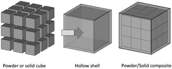 Schematic of the three-dimensional model of the powder/solid composite structure. Powder or solid cube units were combined with a hollow shell structure, as indicated by the arrow.