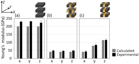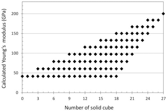 In the structure generated in this study, n = 27. The total number of combinations of the powder and solid arrangements, calculated using Equation (3), shows more than 100 million patterns. Regardless of the above numerous powder/solid positional patterns, the variation in the Young’s moduli of the powder/solid composite structure calculated through the mathematical model is only 10 (Figure 2). The structure with the lowest Young’s modulus, with zero solid parts, corresponds to the hollow shell structure. Because the Young’s modulus of the powder part is significantly lower than that of the solid part and has almost no load-bearing function, the load can be regarded as being supported by the side wall of the structure in the hollow shell part. Therefore, even if the number of solid parts increases, Young’s modulus does not increase when there is no columnar structure to support the load. Moreover, it is considered that, for structures in which the modulus is equivalent to that of the hollow shell part—for example, the face-centered cubic (FCC) model—the wall parts support most of the load. Additionally, the unconnected solid cube parts do not contribute to the load support because they cannot work as a column. On the other hand, the three solid parts arranged in series play the role of a column in the fabricated structure and significantly contribute to the load support. From these facts, it can be concluded that the controlling factors for Young’s modulus in the powder/solid composite structure are the number of columns in which the three solid parts are arranged in a series. From the above, Young’s modulus of the powder/solid composite structure can be predicted by the arrangement pattern of the solid and powder parts using the rule of mixtures.