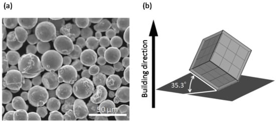 (a) Scanning electron microscopy image showing the morphology of the Co–Cr–Mo powder. (b) Schematic of the building direction.