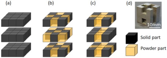 In the L-PBF process, the nonmelted powder remaining around the built structure and inside the porous structure is generally removed through blasting using the same raw metal powder. The removed powder can be reused as a raw metal powder for the additive manufacturing process after eliminating the impurities through sieving. However, as the pore size of a porous structure decreases and the pore shape becomes more complex, it becomes extremely difficult to remove the nonmelted powder inside the pores [,]. Here, we propose a novel powder/solid cube composite by positively enclosing the nonmelted powder inside the structure, which is conventionally removed.