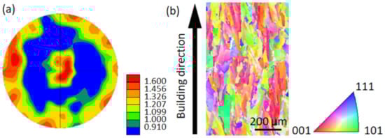 Crystallographic texture of the Co–Cr–Mo alloy. (a) {001} pole figure, and (b) IPF map of the all-solid model.