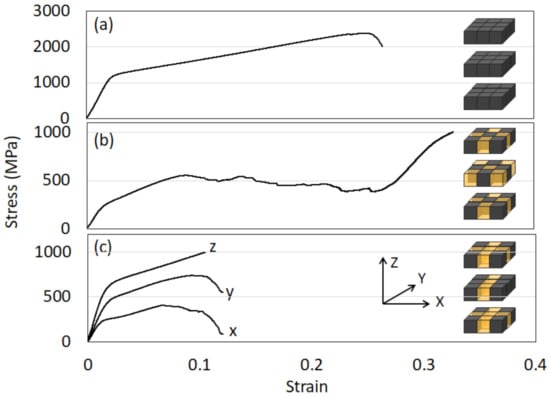 The density of the fabricated all-solid model is 99.52%, indicating that the L-PBF process was well controlled to obtain a highly dense structure. Figure 6 demonstrates the stress–strain curves. Considering the equivalency among the three axes, the deformation behavior in the x-axis is shown as a representative value in the all-solid and FCC models. The plastic deformation and fracture progress depends on the existence of a column structure. Moreover, a characteristic plateau region was observed in the FCC model. The longitudinal Young’s modulus of the structure can be calculated through the rule of mixtures in the arrangement of the solid parts, and it has a certain discrete value regardless of the number of solid parts (Figure 2). Structures having the same longitudinal Young’s modulus indicates that they have the same number of series elements of solid parts parallel to the load direction. The longitudinal Young’s modulus increases in proportion to the number of such series elements. Importantly, from the results of the rule of mixtures calculation, the longitudinal Young’s modulus of the structure is determined by the number of series elements (i.e., series elements that act as a “column” in the structure) parallel to the load axis. Indeed, Young’s modulus changes significantly depending on the presence or absence of a column structure in which all series elements with dense bodies are connected in the load axis direction (Figure 7). In the H-type model, the expression of triaxial anisotropy can be controlled, whereas Young’s moduli along the x-, y-, and z-axes in the all-solid and FCC structures are equivalent. This is an important achievement that introduces a guideline for material design that can achieve the desired isotropy or anisotropy in the required direction.