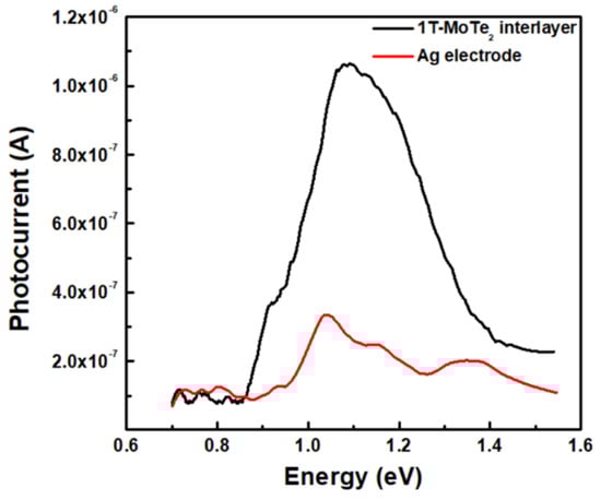 Figure 2 shows the photocurrent (PC) spectra of 2H-MoTe2 with Ag and 1T-MoTe2 interlayer electrode contacts. We can observe the peak arise from ~0.9 eV which was attributed to the energy gap of 2H-MoTe2. It is also noticed here that the photoresponse of 2H-MoTe2 was enhanced a lot by inserting 1T-MoTe2 interlayer electrode contact.