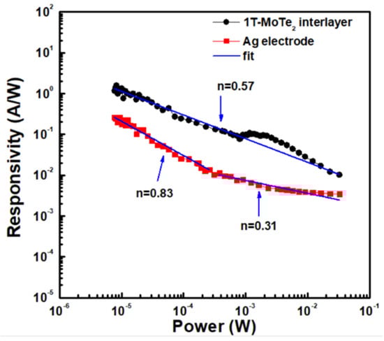 Figure 3 shows the illumination intensity dependent photoresponsivity of using Ag and 1T-MoTe2 interlayer electrode contacts of 2H-MoTe2. The responsivity (R) is defined as the photocurrent generated per unit power of the incident illumination. It shows the responsivity decrease gradually with the increase of illumination intensity. The responsivity can be extracted from the experimental results by using the power law function R = P-n [37,38]. The power equation fits to the experimental data with an exponent (n); the exponent implies the mechanism of carrier recombination and trapping states during the photoresponse process. The obtained n is 0.57 for 1T-MoTe2 interlayer electrode contacts of MoTe2 which is correlated with the mechanism including recombination states and carrier–carrier interactions. However, we observe two slopes with Ag contact sample which means two different recombination mechanisms are involved.