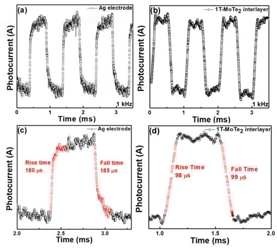 The time-resolved photoresponse dynamics of Ag and 1T-MoTe2 interlayer electrode contacts of 2H-MoTe2 were measured by applying ON/OFF light modulation. Figure 4a,b shows the time-resolved photoresponse of Ag and 1T-MoTe2 interlayer electrode contacts of 2H-MoTe2 with the incident light frequencies of 1000 Hz. In time domain, the speed of photoresponse is characterized by the rise time (tr) and the fall time (tf). The rise time and fall time are defined as the time interval for the response rise from 10% to 90%, and decay from 90% to 10% of its maximum photocurrent value, respectively [39]. A single response cycle at 1000 Hz is shown in Figure 4c,d. The rise and fall times for Ag contact on 2H-MoTe2 are 180 and 185 μs, respectively. Using 1T-MoTe2 interlayer electrode contact reveals a faster rise time of 98 μs, as well as a shorter fall time of 99 μs, which indicate the photoresponse speed can be improved by using 1T-MoTe2 as interlayer contact. The slower photoresponse in Ag contact on 2H-MoTe2 might be due to the influence of trap state which deteriorates the carriers’ transfer efficiency.