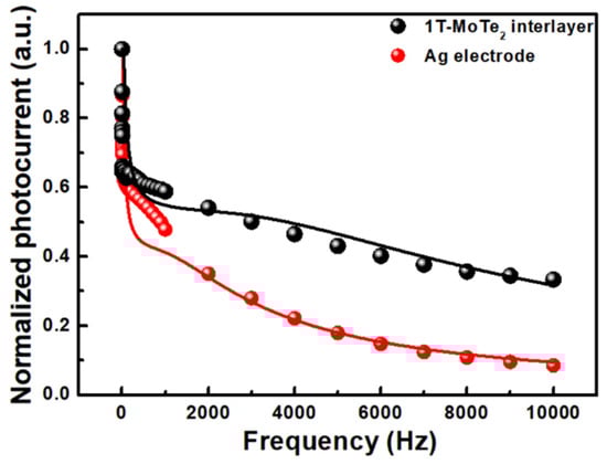 Normalized photoconductivity as a function of the frequency of Ag and 1T-MoTe2 interlayer electrode contacts of 2H-MoTe2.