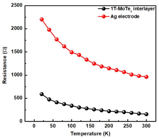 The resistance as a function of temperature in the range from 20 to 300 K for Ag and 1T- MoTe2 interlayer electrode contacts of 2H-MoTe2.