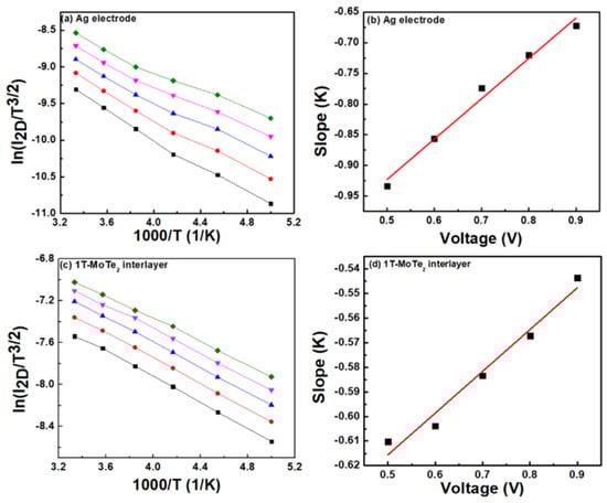 The Arrhenius plot. The ln(I2D/T2/3) against 1000/T for various V for (a) Ag and (c) 1T-MoTe2 interlayer electrode contacts of 2H-MoTe2. Extracted of via ΦB the y intercept value of (b) Ag and (d) 1T-MoTe2 interlayer electrode contacts of 2H-MoTe2.