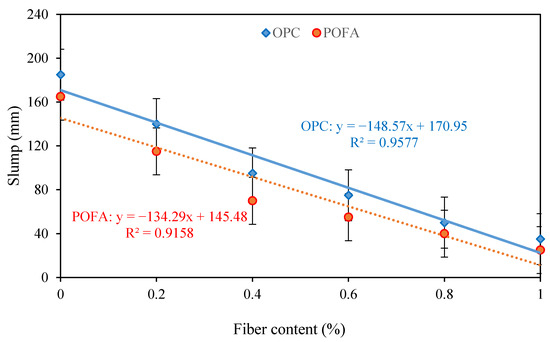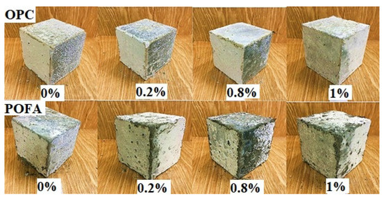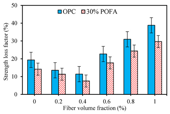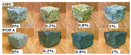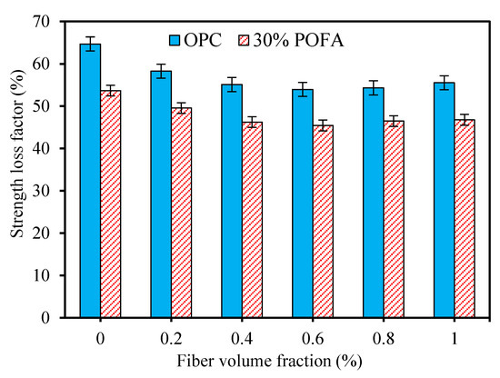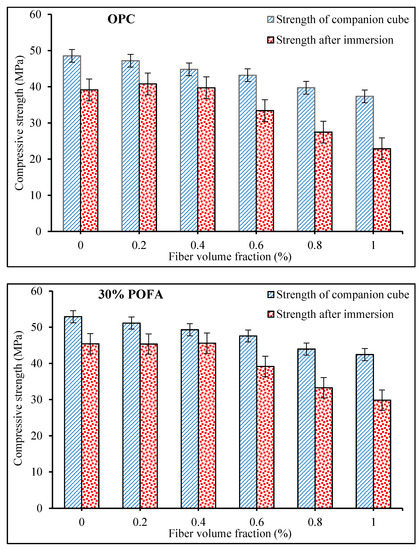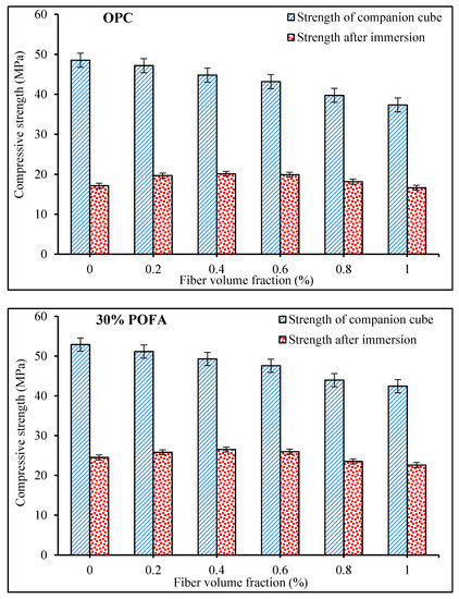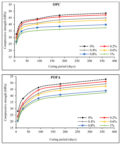 - The compressive strength reduced as the fiber dosage increased. Initially, the strength improvement of POFA mixes was essentially identical to that of OPC concrete mixes. POFA-based concrete mixtures had higher compressive strength than OPC concrete mixtures after extended curing times. At 365 days, the obtained compressive strength values for POFA concrete mixes ranged from 42 MPa to 52.9 MPa, which is higher than the values reported for OPC mixes. POFA’s pozzolanic activity, which produces additional hydration products, can account for the higher strength values in POFA mixes.