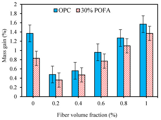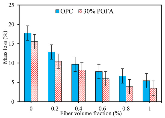 - After being exposed to acid, the mass variation of plain and reinforced concrete specimens was negative, whereas the mass variation of sulfate-treated samples was positive. The rate of mass change in mixtures comprising WPFT fiber and POFA, on the other hand, was lower than that in the OPC combinations. Adding WPFT fibers to concrete exposed to chemical attacks was a good technique for controlling mass changes. The mass loss of POFA concrete specimens reinforced with 1% fibers after 12 months of exposure in the H2SO4 solution was recorded as 3.5%, which is comparatively lower than that of the 15.5% recorded for the plain concrete without fibers.