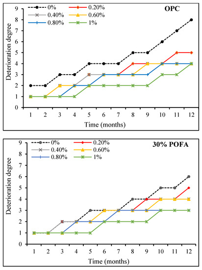 - Due to the increased CaO content in ordinary Portland cement, the deterioration of OPC-based concrete mixtures was more severe and quicker than that of the POFA mixtures exposed to aggressive environments.