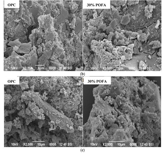 - SEM analysis of the pastes treated with 10% MgSO4 and 5% H2SO4 solutions revealed how the specimens changed in these harsh conditions. As a result of exposure, the pores of the OPC matrix eventually filled up with other precipitated elements. Furthermore, in the POFA mixtures, most voids were filled with these products due to POFA’s pozzolanic action and additional C-S-H gel, especially at later ages, which developed the performance of the concrete.