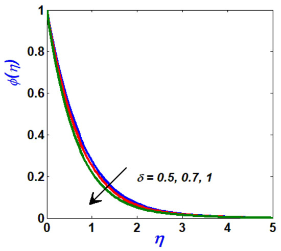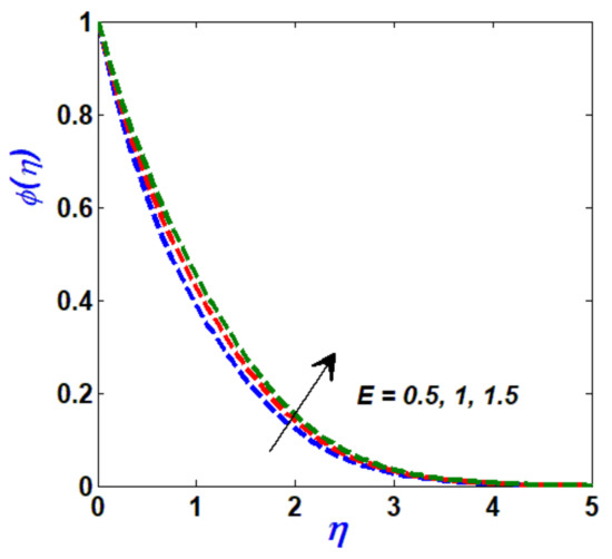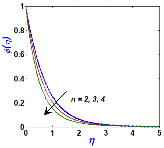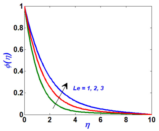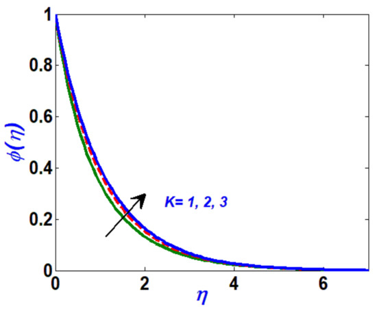 Figure 9 displays concentration profile as the increasing function of parameter K. This means that more bendiness of the curved channel helps in growing the said profile. Moreover, the same profile shows an upsurge when we increased the parameter and (this is seen in Figure 9). Thermophoresis is the phenomena due which fluid a particle departs from hotter to colder region, increasing thereby more thermal activity. Figure 10 also portrays the similar picture for the same profile when the Lewis number is increased. Figure 11 depicts that increase in activation energy enhances chemical reaction concentration at the boundary layer, which results in an upsurge of the concentration profile. In Figure 12 the same profile is seen as increasing function of Pr number initially, but the reverse behavior is displayed by the profile after halfway down. In Figure 13, the behavior of the same profile is seen with reference to fitted rate constant n. Increasing n results in decrease in the chemical reaction which eventually reduces the profile. In Figure 14 the same profile shows upsurge when we increase the Lewis number Le. Figure 15 manifests the fact that if we increase the temperature difference parameter (difference between wall and ambient temperature) the same profile declines. Similarly, in Figure 16 we witnessed the decreasing trend of under discussion profile when we enlarged the reaction rate parameter .