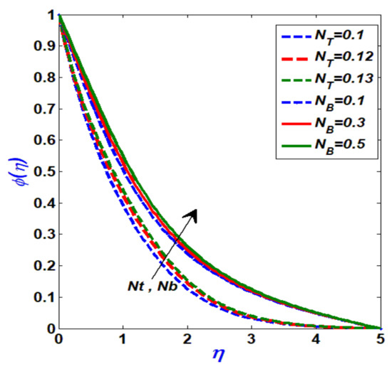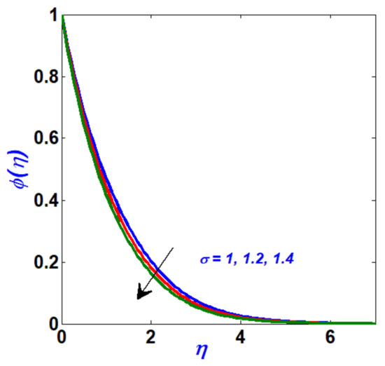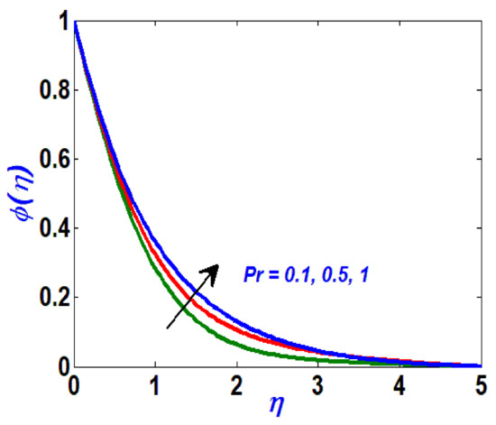 The temperature of the fluid is measured by averaging the kinetic energy. When the channel is more curved higher K the fluid finds less surface to interact with, which consequently reduces the kinetic energy of the fluid and finally the mercury level will also go down. This fact has been witnessed by plotting Figure 5. Figure 6 displays the fact that the temperature rises for large values of Thermophoresis and Brownian motion parameter . While Figure 7 portrays different picture as we see the temperature profile is the decreasing function of Prandtl number, this supports the concept that lower values of Prandtl number is suggested for better fluid flow and heat exchange among fluid particles. Figure 8 portrays the fact that when we increased the chemical reaction parameter the temperature of the fluid is increased. This happened because chemical process speeds up the interaction between the fluid molecules which speeds up the kinetic energy which result in the increase of temperature profile.