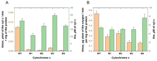 Comparison of the kinetic parameters Amax (orange columns) and Km (green columns) of the (A) succinate:cytochrome c-reductase and (B) cytochrome c-oxidase reactions in rat liver mitoplasts in the presence of the externally added WT and mutant cytochromes c T78N/K79Y/M80I/I81M/F82N (M1), T78S/K79P (M2), I81Y/A83Y/G84N (M3), and P76I/G77L/I81L/F82L (M4).
