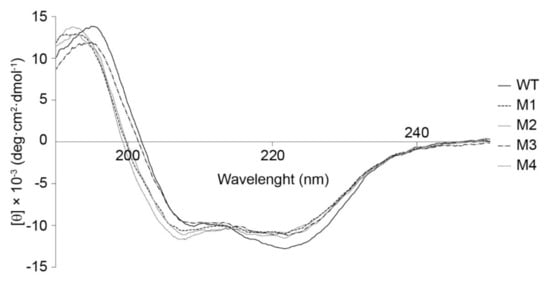 The analysis of the CD spectra (Figure 2) revealed that the content of the α-helical elements in the secondary structure of mutant cytochromes decreased by 9–14% compared to the WT cytochrome c (Table 1). At the same time, the content of the fraction with the non-ordered structure in mutant variants was 3–6% lower than that in WT, while the number of β-layers was higher than that in WT cytochrome c by 33–50% (Table 1). These findings allow one to say that the increased content of β-structural motifs achieved by introduction of amino acid substitutions into cytochrome c reduced the conformational mobility of the studied protein fragment P76GTKMIFA83. Overall, the CD spectroscopy data demonstrate that the degree of ordering of the structure of mutant variants has slightly increases compared to that in the wild-type cytochrome c.