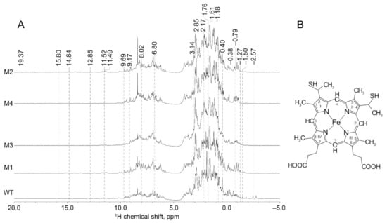 (A) The 1H-NMR spectra of cytochrome c (WT) and its mutant variants (M1-T78N/K79Y/M80I/I81M/F82N, M2-T78S/K79P, M3-I81Y/A83Y/G84N, M4-P76I/G77L/I81L/F82L); (B) Structural formula of heme c with numeration of C atoms.