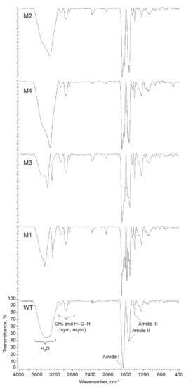The IR spectra of cytochrome c (WT) and its mutant variants (M1-T78N/K79Y/M80I/I81M/F82N, M2-T78S/K79P, M3-I81Y/A83Y/G84N, M4-P76I/G77L/I81L/F82L).