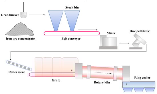 As an important component of ironmaking charge, pellets are characterized by their high grade, uniform particle size, better strength and metallurgical performance than natural lump ores and sinters; the advantages in environmental protection and energy conservation are especially obvious [1]. The iron ore pellets produced by grate-kilns can obtain high yield, better adaptability to raw materials, uniform roasting temperature and stable product quality [2]. In addition, the grate-kiln method can use a variety of fuels to provide heat, which is especially beneficial to countries with rich coal resources [3]. These advantages made the method of grate-kiln producing iron ore pellets develop rapidly in the world [4,5]. However, the deposit formed during the pellet roasting process has become a widespread problem, which seriously restricts the further development of this method.