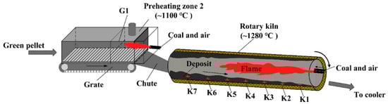 The distribution of deposits in a grate and rotary kiln is mainly affected by pulverized coal injection and temperature field [21,22]. As shown in Figure 2, at the heads of the rotary kiln, pulverized coal is sprayed with high-pressure air and burned to provide heat for the drying, oxidation and consolidation of pellets. In addition, the high-temperature exhaust gas from the cooler serves as the secondary air to provide a stable temperature field for the grate and the rotary kiln [23]. Influenced by the flame shape generated by pulverized coal combustion, the temperature in the middle of the rotary kiln is usually higher than that in the head and tail of the kiln [24,25]. Therefore, the deposit-forming phenomenon in the middle of the kiln is more pronounced. In previous experiments, we selected the sediments from different regions of the grate and rotary kiln for chemical element composition analysis, as shown in Table 1 [2,26]. The obtained results indicate that the total iron content from K1 to K7 showed a decreasing trend, while the contents of K, Na and Si increased gradually. This study confirmed that the distribution regularity of chemical composition of deposit in the rotary kiln was mainly affected by pulverized coal injection. The residual coal ash produced by pulverized coal combustion is driven by hot air to the kiln tail, which makes the deposit in the K4-K7 region contain more coal ash components, while the chemical composition of the deposit in the K1-K3 region is similar to pellets.