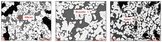 Figure 4 shows the microstructure of the rotary kiln deposit of iron ore pellets. The deposits are usually composed of hematite, silicate (hedenbergite and anorthite), spinel [27]. In the process of high-temperature roasting, hematite particles from preheated pellet powder adhere together in the molten silicate binding phase to form the microstructure of deposits in rotary kiln [31]. The binding phase is composed predominantly of SiO2, CaO, Al2O3, MgO and Fe2O3. Because of the better fluidity, the silicate melt depends on its own gravity and the rotary kiln centrifugal force to continuously deposit on the kiln lining, which results in the deposit microstructure becoming denser [32]. Meanwhile, the combustion of fixed carbon in the incomplete burned pulverized coal produces a local reducing atmosphere in the pellet powder, which reduces Fe3+ to Fe2+. Then, the Fe2+ reacts with MgO and Al2O3 to form spinel [26]. In general, the microstructure formed by the bonding of silicate melt with hematite and spinel has high strength, which makes it difficult to be completely destroyed by the friction and collision from the rolling pellet layer [33].