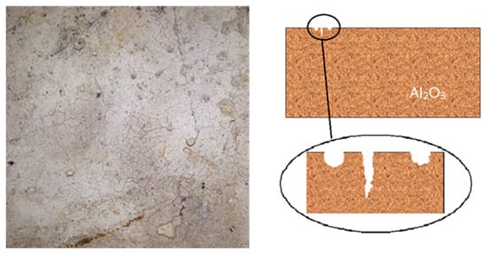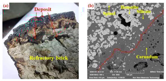 The refractory material of the lining in the coal-fired rotary kiln is usually composed of corundum and mullite [34,35]. Previous studies have analyzed the process of deposit adhesion and penetration on refractory bricks [36]. The adhesion of the deposit first occurs at the defects on the refractory brick surface. As shown in Figure 5, due to the thermal impact in the process of high-temperature roasting, the surface temperature of refractory bricks is too high to produce the “separation” phenomenon, which results in cracks [37]. The deposits formed by preheated pellet powder and incomplete burned pulverized coal preferentially accumulate at these defects. The testing of rotary kiln lining refractory bricks used for 14 months reveals a minimal amount of silicate glassy phases around corundum particles on the bricks’ surface, which indicates that the penetration of the sedimentary liquid phase is not apparent at this time. After four years of usage, the surface of refractory bricks adheres to a thicker hematite layer. Meanwhile, due to the erosion of the liquid phase, part of the corundum particles are released, migrate to the hematite layer and react with hematite to form a spinel-type solid solution [32]. From Figure 6a, we can clearly observe the adhesion and erosion of deposits to refractory materials. From Figure 6b, as the service of rotary kiln lining refractory bricks continues, the grain boundary between the hematite layer and the corundum layer becomes indistinguishable. Affected by the infiltration of the molten liquid phase, hematite and corundum particles migrate between deposits and refractories. In addition, when the deposits grow enough to affect the pellet production, it is necessary to frequently stop the operation of the rotary kiln to remove them. In the cooling process of rotary kiln, the volume contraction of the silicate glass phase will generate cracks and fracture surfaces in the deposits. With the kiln rotating, large chunks of deposits fall off the lining to be discharged under the influence of gravity. The erosion effect of the deposits makes them closely connected with the refractory brick. Because of the weak tensile strength, with the shedding of deposits, the surface layer of refractory materials may be separated to shorten their service life [38].