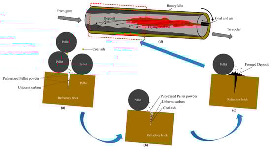 The pellet production system relies on the combustion of pulverized coal ejected from the coal injection device to provide heat for pellet drying, preheating and roasting. However, the pulverized coal injection usually can not burn completely [39], which causes a small amount of fixed carbon left in the coal ash [40]. As shown in Figure 7, the unburned carbon and coal ash are sprinkled in the pellet layer and mixed with the pulverized pellet powder. This mixed powder enters into the gaps of refractory brick while it is rolling with the pellets. The high temperature in the rotary kiln causes the residual carbon combustion to produce a local reducing atmosphere, which reduces the Fe3+ to Fe2+ [41]. With the increase of Fe2+ content, the melting point of the mixed powder decreases, and the liquid phase gradually erodes the surface of the refractory brick [42]. Meanwhile, the liquid phase adheres to more pulverized pellet powder, coal ash and unburned carbon through its surface tension [8]. In this way, the initial deposits on the surface of refractory brick are formed. As the circulation of the adhesion process continues, the deposits gradually thicken in a “layer by layer” pattern, and eventually form a solid construction.