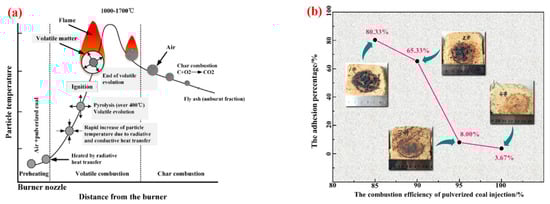 Effect of pulverized coal combustion efficiency, including (a) illustration of combustion phenomena of pulverized coal [26]; (b) the adhesion performance of pulverized coal with 85–100% combustion efficiency [43].