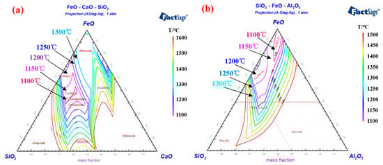 The phase diagram, including (a) phase diagram of FeO-CaO-SiO2; (b) phase diagram of FeO-Al2O3-SiO2.