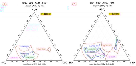 The phase diagram, including (a) phase diagram of SiO2-CaO-Al2O3-FeO (1200 °C); (b) phase diagram of SiO2-CaO-Al2O3-FeO (1300 °C) [10].