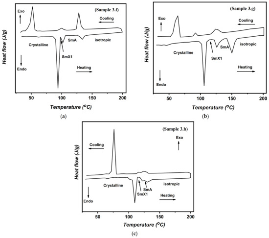 Transition temperatures and the corresponding associated enthalpy changes of the prepared compounds 3.b–3.h were measured by DSC and presented in Table 1. DSC curves of heating/cooling cycles for the new compounds 3.f, 3.g and 3.h are presented in Figure 1. All the newly and previously reported prepared biphenyl [39] and 4-phenyl pyridine compounds displayed dimorphic enantiotropic mesomorphic properties, whereby the corresponding endotherms were regarded as follows according to the increase in temperature: Crystalline to smectic X1 (Cryst.-SmX1), SmX1 to smectic A (SmX1-SmA) and SmA-isotropic (SmA-I) transitions. The SmX1 and SmA mesophases were identified by the presence of the standard Schlieren and focal-conic fan textures.