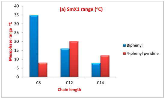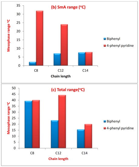 The effects of increase in alkyl chain length on the thermal properties of both biphenyl and phenyl pyridine mesogens on the temperature range of the different smectic mesophases as well as the total mesomorphic range of temperature is presented in Figure 3a–c. The results showed an increment in the Cryst.-SmX1 transition temperatures upon the increase of the terminal alkyl group (C8 to C14). It was also observed that the transition temperatures for SmX1-Sm A mesophase change increase as we go from 3.f to 3.g and then decrease for sample 3.h. In addition, the SmA-I transition temperatures revealed a similar response towards the increase of the terminal alkyl group (C8 to C14). Again, the transition temperatures for SmA-I mesophase change increase as we go from 3.f to 3.g and then decrease for sample 3.h.