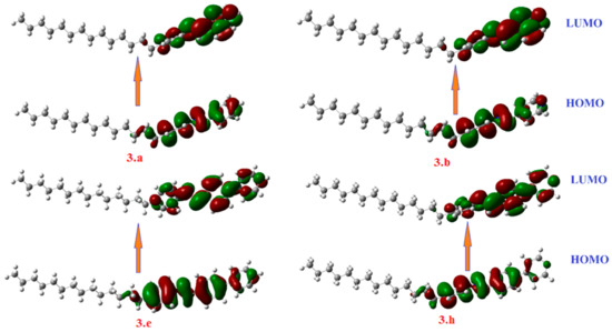Table 3 and Figure 5 present the predicted plots of the prepared compounds frontier molecular orbitals HOMO (highest occupied) and LUMO (lowest unoccupied), 3.a, 3.b, 3.e and 3.h. The electron densities of the sites involved in LUMO formation as well as HOMO formation are localized on the pyridyl part and its conjugated rings, see Figure 5. The degree of the conjugated rings as well as the presence of the hetaryl atom, on the other hand, had an effect on the electron densities of the FMOs. Moreover, the degree of conjugation and the presence of the N-atom had a significant effect on the FMO energy frontier levels and the frontier molecular orbital energy gab. Levels of the frontier molecular orbitals were impacted by the attachment of more aromatic rings. The presence of the N-atom instead of the carbon significantly lowered the energy level of the frontier molecular orbitals. Moreover, the extraconjugation of the prepared biphenyl derivative 3.b and its pyridyl derivative 3.f highly affected the energy difference between the FMOs. However, the pyridyl derivative showed more decrement concerning the energy gab than the phenyl one. This result could be illustrated in terms of increments of the co-planarity in the case of the pyridyl derivative with respect to its phenyl, which resulted in extra conjugation of the aromatic rings and a decrease in the FMO energy gap.