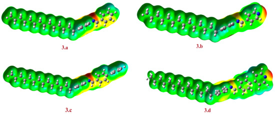 The charge distribution map for the prepared compounds 3.a, 3.b, 3.e and 3.h was calculated using the same method on the same basis sets according to molecular electrostatic potential (MEP) as presented in Figure 6. In addition, the molecular electrostatic potential (MEP) is a crucial property for studying the electron density distribution over molecules [44,45,46]. Furthermore, MEP is one of the most effective methods for determining whether or not a substance has intermolecular and/or intramolecular interactions. Except for the phenyl derivatives 3.a and 3.e, the presence of the polar N-atom and the linking CH=N group of the studied compounds had an impact on the localization of the iso-electronic density of the electron rich and electron deficient areas, whereas the CH=N group of the Schiff base part shows the most electron deficient site, while the terminal alkoxy chain is the most electron rich part. The predicted charge distribution maps could be a tool for illustration of the mesophase formation enhanced by the liquid crystals.