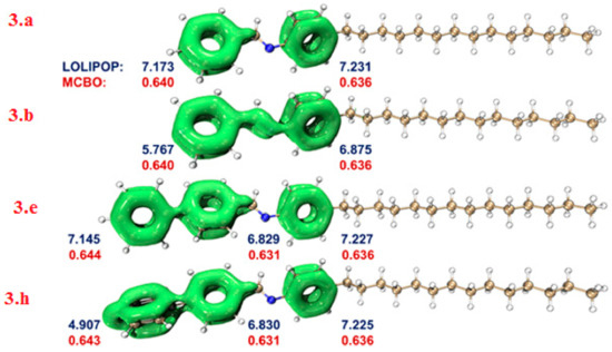 Based on optimized geometries of compounds 3.a, 3.b, 3.e and 3.h, the Multiwfn 3.8 code [47] was employed to investigate delocalization, aromaticity and π–π stacking strengths of all phenyl and pyridine rings. Aromaticity and cyclic delocalization were evaluated using the normalized multicenter bond order (MCBO) index, [48] where a larger MCBO value resembles stronger aromatic ring. The π–π stacking strength can be estimated by means of the localized orbital locator integrated π over plane (LOLIPOP) index [49] namely the lesser the LOLIPOP index of a ring, the stronger its π-stacking ability. Moreover, the isosurface of localized orbital locator purely contributed by π-orbitals (LOL-π) [50] was calculated using the Multiwfn code and visualized using the VMD code [51]. The isosurface maps of LOL-π of the studied compounds, as well as calculated LOLIPOP values and normalized MCBO results are displayed in Figure 1. The calculated total number of π orbitals for compounds 3.a, 3.b, 3.e and 3.h are 6, 7, 9 and 10 orbitals, respectively. It can be seen from the occurrence regions and shapes of the LOL-π isosurfaces that C-substitution of imine with pyridine in compound 3.b extends conjugation along the N7=C8 bond, besides slightly extending π-conjugation to the first C in the long alkyl chain. Bond length of N7=C8 was found to increase in the order: 3.b (1.275 Å) < 3.a = 3.e (1.276 Å) < 3.h (1.277 Å), which is in line with the wide range delocalization nature of the localized π-orbitals map of 3.b. Additionally, strong delocalization of π-electrons can be observed in biphenyl and phenylpyridine moieties. It can also be noticed that all rings have a comparable six-center aromatic conjugation. Quantitative valuation of aromaticity, using normalized MCBO aromaticity index, shows that all inner phenyl rings have the same aromaticity (0.636). Similarly, central phenyl rings of 3.e and 3.h have identical aromaticity (0.631). One can also conclude that pyridine and benzene terminal rings of 3.a and 3.b, respectively, exhibit a similar degree of cyclic delocalization. From the difference in MCBO values of different rings, terminal benzene and pyridine rings of 3.e and 3.h compounds have the strongest aromatic character. When compared to free benzene (3.a), central benzene rings of 3.e and 3.f suffer a slight but significant reduction of aromaticity. Overall, the most aromatic rings are the terminal ones. According to relative values of the LOLIPOP index, a stronger π-stacking ability is most expected for terminal pyridine rings of 3.b and 3.f compounds, while inner phenyl rings of 3.a, 3.e and 3.h are predicted to have the weakest stacking interaction ability. Considering the average LOLIPOP taken over rings located at the molecular periphery, π-stacking strength of studied compounds is predicted to show the trend: 3.b (6.321) > 3.e = 3.h (7.028) > 3.a (7.202). The results of the aromaticity, π–π stacking and LOL-π could be a good illustration of the mesomorphic behaviour of the investigated compounds, Figure 7.