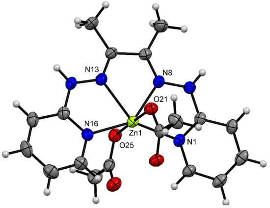 Ellipsoidal representation of [Zn(LH2)(OAc)2]·H2O (2) showing 50% thermal ellipsoids (the water molecule was omitted for clarity). Selected bond lengths [Å] and angles [°]: Zn1-N1 = 2.176(2), Zn1-N8 = 2.190(2), Zn1-N13 = 2.205(2), Zn1-N16 = 2.177(2), Zn1-O21 = 2.063(2), Zn1-O25 = 2.091(2), N(1)-Zn(1)-N(16) = 143.66(9), O(21)-Zn(1)-O(25) = 178.71(9).